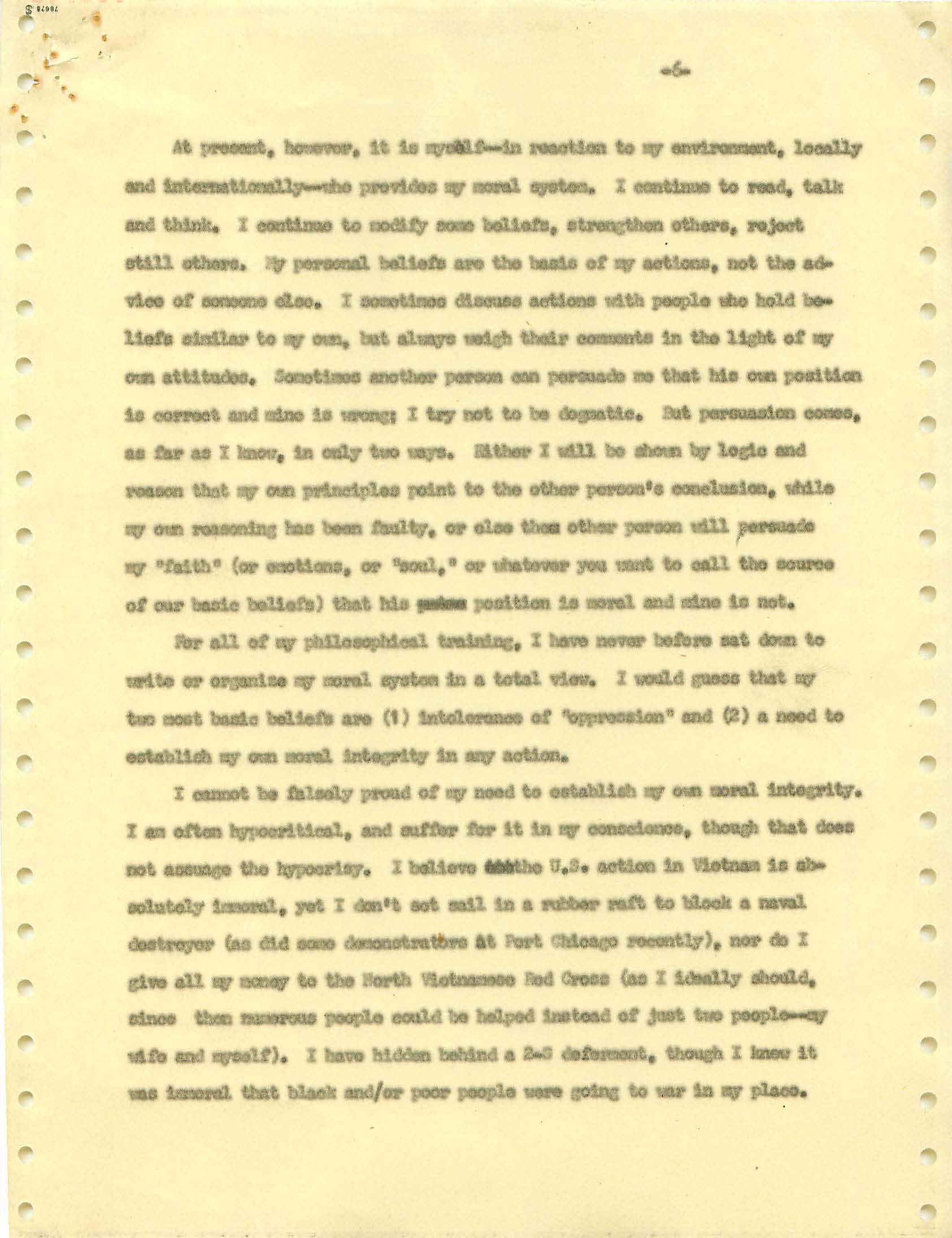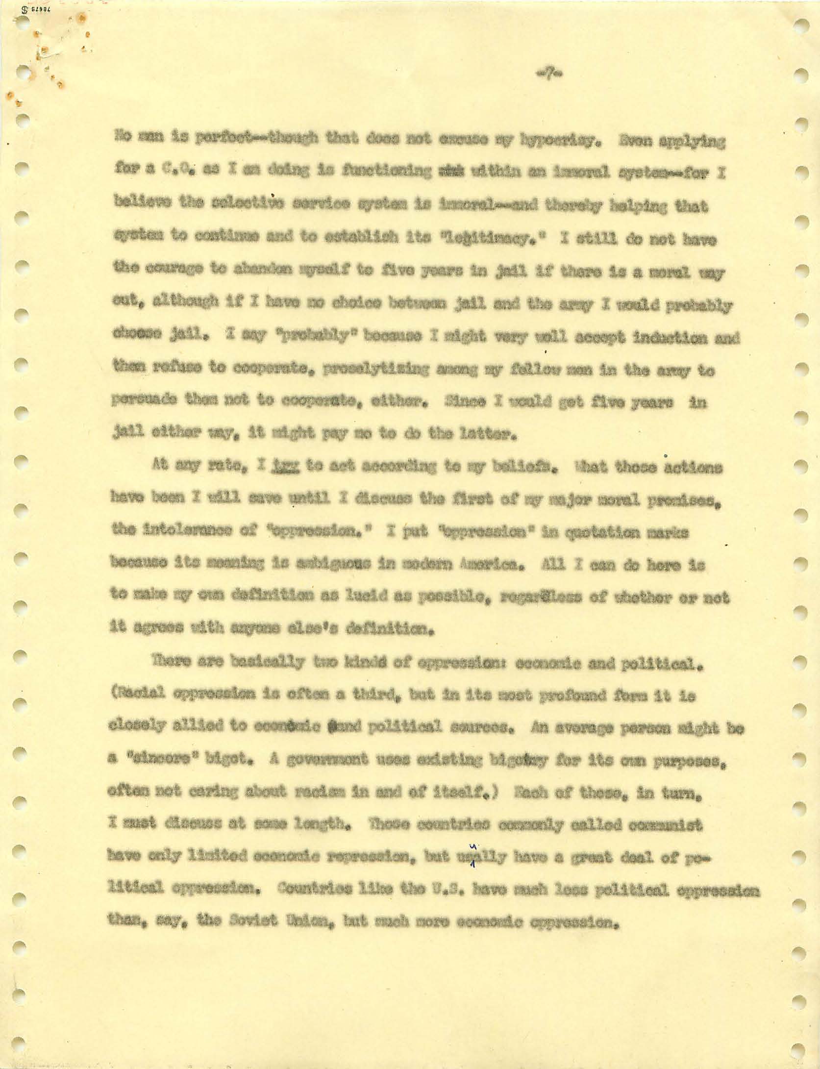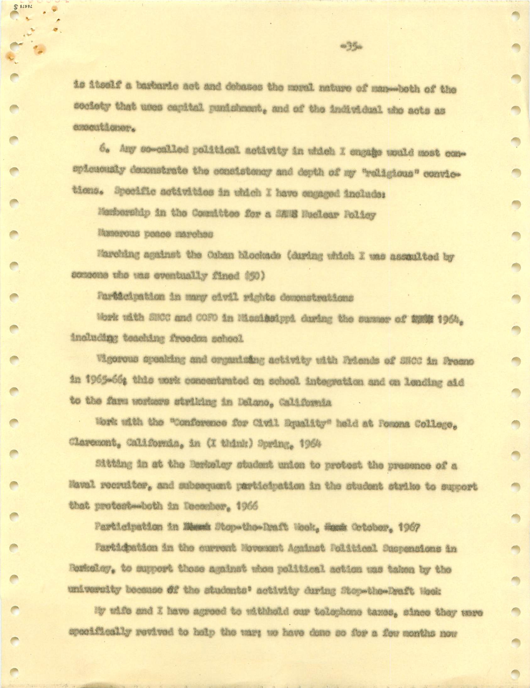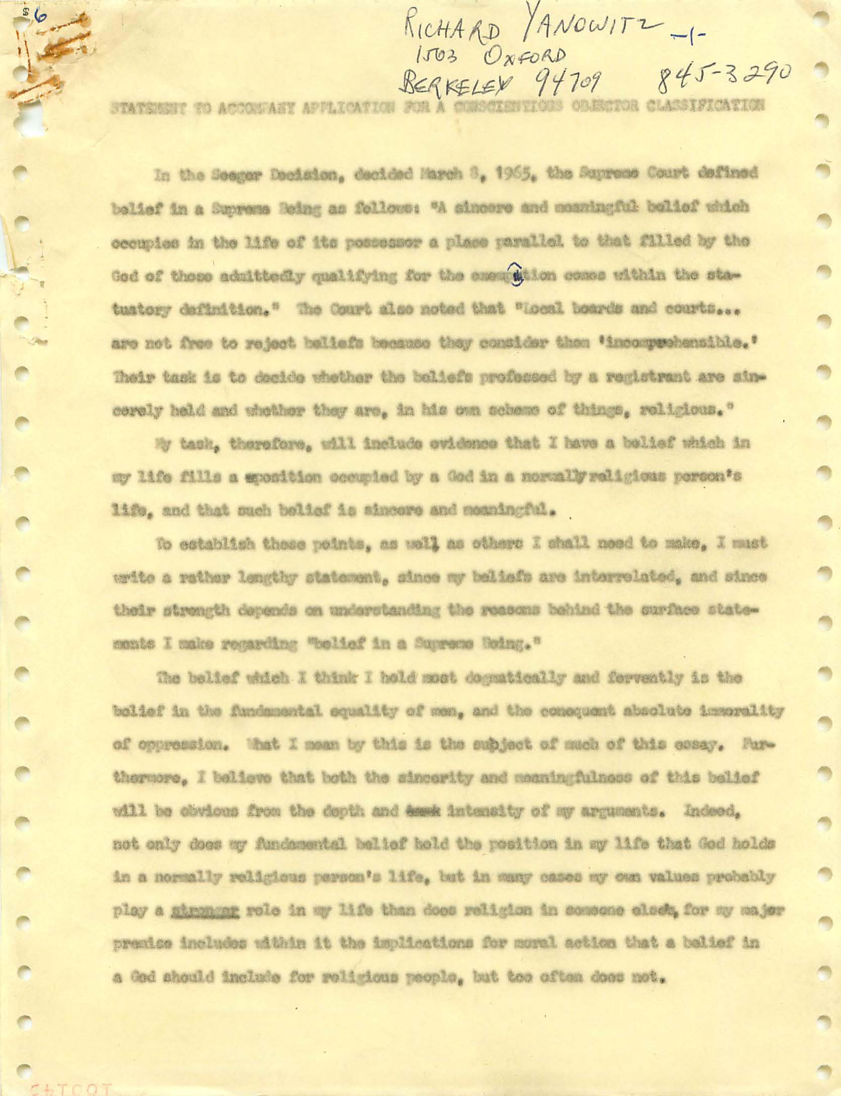 November 22, 2008 During the Vietnam War I was a draft dodger--that is, I determined to avoid getting drafted. I made sure my passport was up to date, and I took student deferments every year. In the anti-war movement, this was a virtue. For much of the rest of the country, it was at best cowardly and at worst a willingness to let other young men die in my place. (As I write, it has been fashionable for some years for many to look back on that war, however morally wrong it is now viewed, and extol service in the war. That is, avoiders of that draft still get a bad press.) I was certainly scared of fighting or getting killed, and even before Vietnam I sensed that with my propensity to challenge authority I wouldn't last long in the military; but I also believed (perhaps partly but certainly not wholly out of convenience) the US was fighting an immoral war and that refusing to fight was an act of moral rectitude. I have never believed in patriotism, and love to quote that great conservative mind, Samuel Johnson, that "patriotism is the last refuge of a scoundrel." I believed that most of the young men serving in the war were dupes of our government, and I like to think that I did not approve of harassing vets who returned home. (This is probably true because it would echo what I do remember clearly: that despite the frequent, appalling antagonism of police to the Movement--whatever that was, exactly--I never felt comfortable with fellow lefties calling them "pigs.") I also didn't buy fellow left-wingers extolling of the Viet Cong or the North Vietnamese regime, but I did view the North as a lesser evil than the often corrupt and always right-wing South Vietnamese governments. (Readers may recall that the US has long had a propensity to back "friendly" regimes regardless of their politics against "enemy" regimes, which in those days were anything that called themselves communist and today anything our leaders choose to label "terrorist.") One of the less palatable arguments to support North Vietnam was that because Vietnam was a single country, the North could not be invading the South--that is, it could not be invading its own country. I did have the nerve to burn my draft card (though I admired those who did); I was terrified of any action that would send me to prison. Until 1965, when I turned 25, if you had student deferments you were, for practical purposes, draft-proof once you were 26. That year, however, a new draft law was enacted that created a draft lottery (you were called up according to your birthday, and birthdays were randomly sequenced for a given year). In addition, those who received any student deferments after passage of the law would go into the lottery up to the age of 35. If you believed in the draft, this was certainly a fairer way of taking kids and minimizing manipulation, principled or cynical, of the rules to avoid the war. As a wily young guy, I devised the following scheme to avoid going into the lottery. It worked. When the law passed, I was a grad student at Berkeley and had a student deferment under the old dispensation that would last until September. My 26th birthday was the following February. So from my point of view I had to avoid getting a student deferement in September but string out my draft ineligibility for another five months. The following timetable is approximate. First, when I registered for coursework in September, I did not request a student deferement. As I expected, it took awhile for my draft board in South Jersey--let's guess late September or sometime in October. I received a notice that I was reclassified as 1-A (immediate draft eligibility). I think I had 30 days from the date of re-classification to appeal. Sojust before the deadline, I sent out my appeal to be classified as a CO. Probably what happened was that I then received papers to apply for this classification (which would explain why I refer to "3 days" in my statement below, though it possible that I just procrastinated.) After I submitted this statement there would be another long delay while my draft board got around to rejecting it. (I assumed they didn't read much of the statement, if any at all; I should have put at the beginning the closing punch line requesting the board members to resign in the face of my compelling arguments....) I then had at least one appeal of the rejection, which offered another 30-day window, then that appeal had to be rejected. Perhaps there were even more ways of delaying. In any event, I easily passed my 26th birthday while all this back-and-forth went on. Footnote: