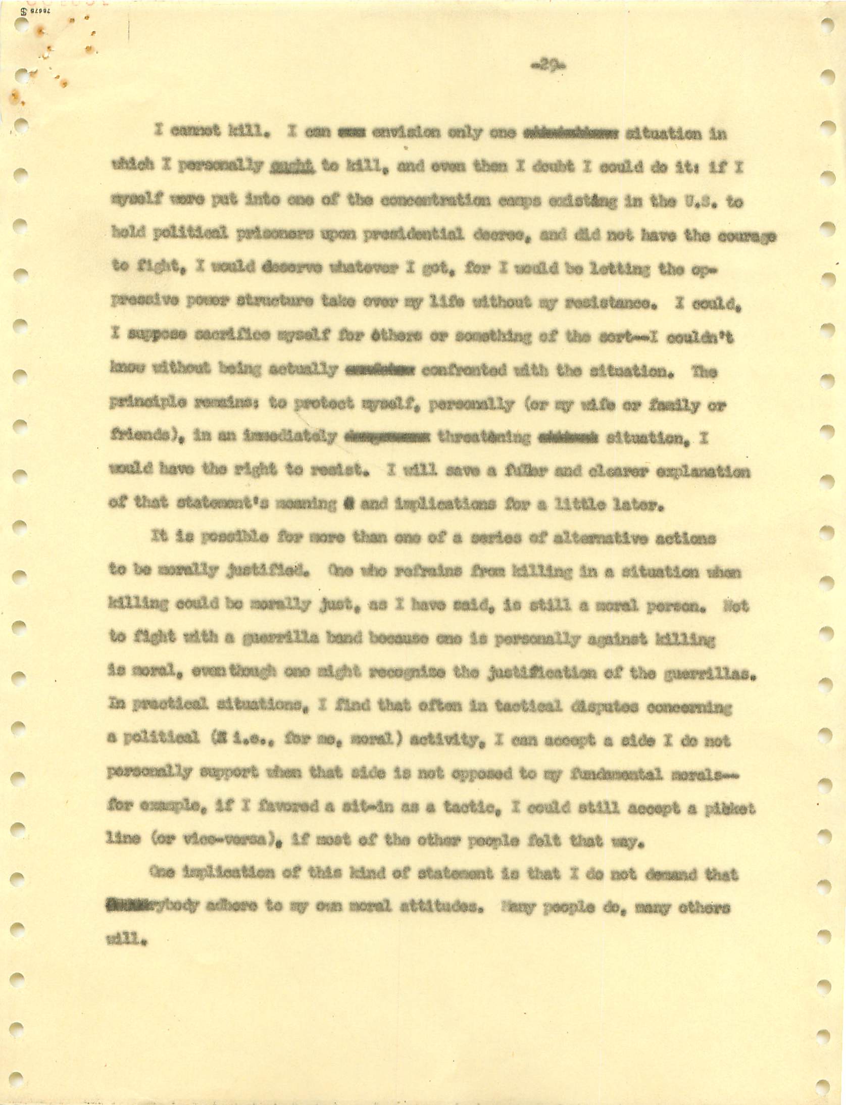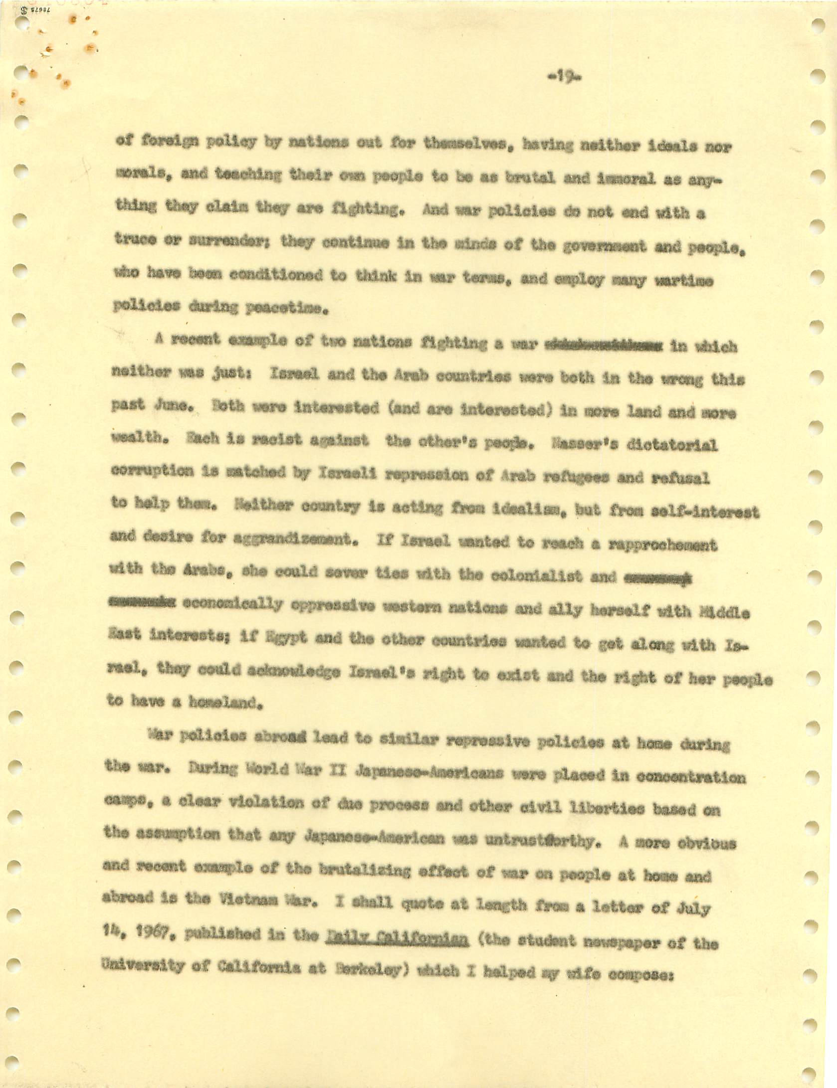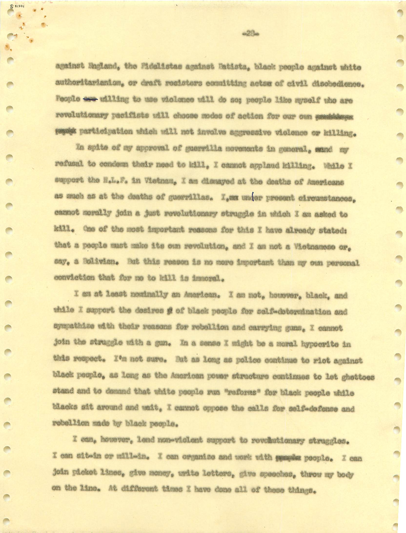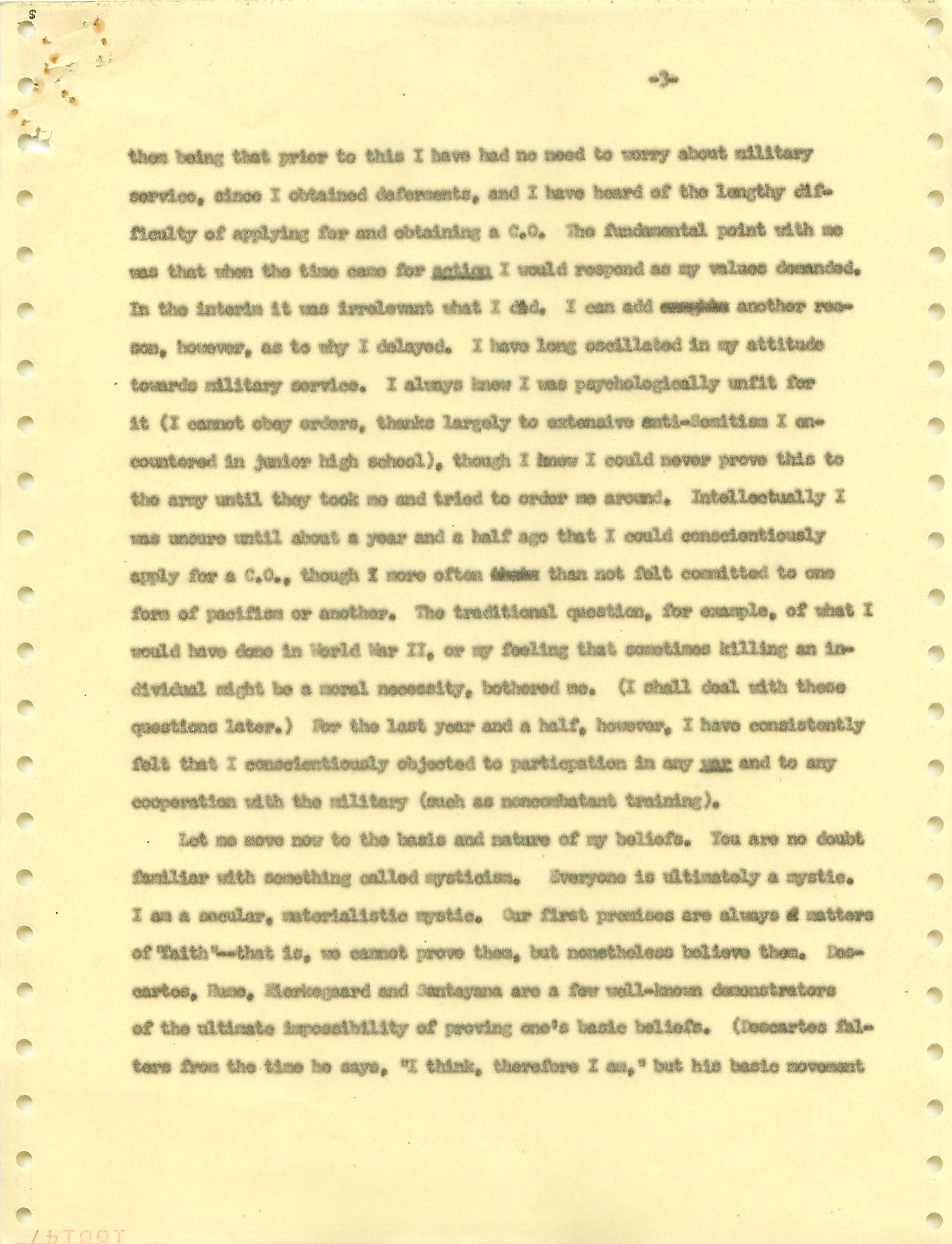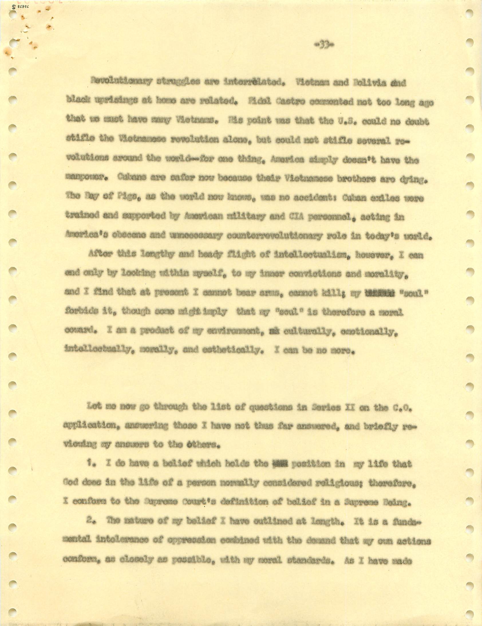 November 22, 2008 During the Vietnam War I was a draft dodger--that is, I determined to avoid getting drafted. I made sure my passport was up to date, and I took student deferments every year. In the anti-war movement, this was a virtue. For much of the rest of the country, it was at best cowardly and at worst a willingness to let other young men die in my place. (As I write, it has been fashionable for some years for many to look back on that war, however morally wrong it is now viewed, and extol service in the war. That is, avoiders of that draft still get a bad press.) I was certainly scared of fighting or getting killed, and even before Vietnam I sensed that with my propensity to challenge authority I wouldn't last long in the military; but I also believed (perhaps partly but certainly not wholly out of convenience) the US was fighting an immoral war and that refusing to fight was an act of moral rectitude. I have never believed in patriotism, and love to quote that great conservative mind, Samuel Johnson, that "patriotism is the last refuge of a scoundrel." I believed that most of the young men serving in the war were dupes of our government, and I like to think that I did not approve of harassing vets who returned home. (This is probably true because it would echo what I do remember clearly: that despite the frequent, appalling antagonism of police to the Movement--whatever that was, exactly--I never felt comfortable with fellow lefties calling them "pigs.") I also didn't buy fellow left-wingers extolling of the Viet Cong or the North Vietnamese regime, but I did view the North as a lesser evil than the often corrupt and always right-wing South Vietnamese governments. (Readers may recall that the US has long had a propensity to back "friendly" regimes regardless of their politics against "enemy" regimes, which in those days were anything that called themselves communist and today anything our leaders choose to label "terrorist.") One of the less palatable arguments to support North Vietnam was that because Vietnam was a single country, the North could not be invading the South--that is, it could not be invading its own country. I did have the nerve to burn my draft card (though I admired those who did); I was terrified of any action that would send me to prison. Until 1965, when I turned 25, if you had student deferments you were, for practical purposes, draft-proof once you were 26. That year, however, a new draft law was enacted that created a draft lottery (you were called up according to your birthday, and birthdays were randomly sequenced for a given year). In addition, those who received any student deferments after passage of the law would go into the lottery up to the age of 35. If you believed in the draft, this was certainly a fairer way of taking kids and minimizing manipulation, principled or cynical, of the rules to avoid the war. As a wily young guy, I devised the following scheme to avoid going into the lottery. It worked. When the law passed, I was a grad student at Berkeley and had a student deferment under the old dispensation that would last until September. My 26th birthday was the following February. So from my point of view I had to avoid getting a student deferement in September but string out my draft ineligibility for another five months. The following timetable is approximate. First, when I registered for coursework in September, I did not request a student deferement. As I expected, it took awhile for my draft board in South Jersey--let's guess late September or sometime in October. I received a notice that I was reclassified as 1-A (immediate draft eligibility). I think I had 30 days from the date of re-classification to appeal. Sojust before the deadline, I sent out my appeal to be classified as a CO. Probably what happened was that I then received papers to apply for this classification (which would explain why I refer to "3 days" in my statement below, though it possible that I just procrastinated.) After I submitted this statement there would be another long delay while my draft board got around to rejecting it. (I assumed they didn't read much of the statement, if any at all; I should have put at the beginning the closing punch line requesting the board members to resign in the face of my compelling arguments....) I then had at least one appeal of the rejection, which offered another 30-day window, then that appeal had to be rejected. Perhaps there were even more ways of delaying. In any event, I easily passed my 26th birthday while all this back-and-forth went on. Footnote: