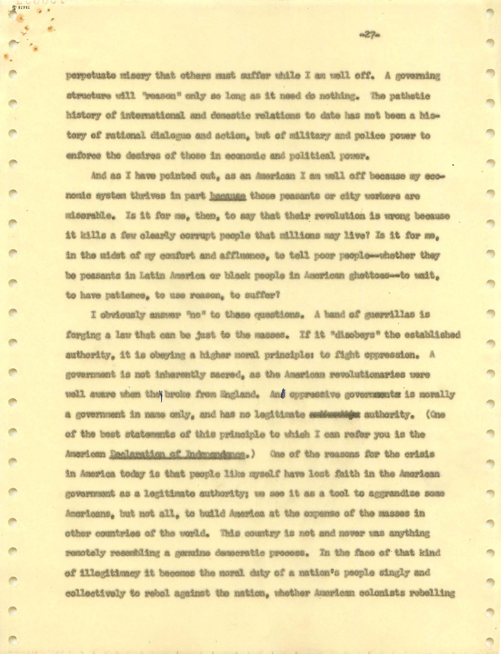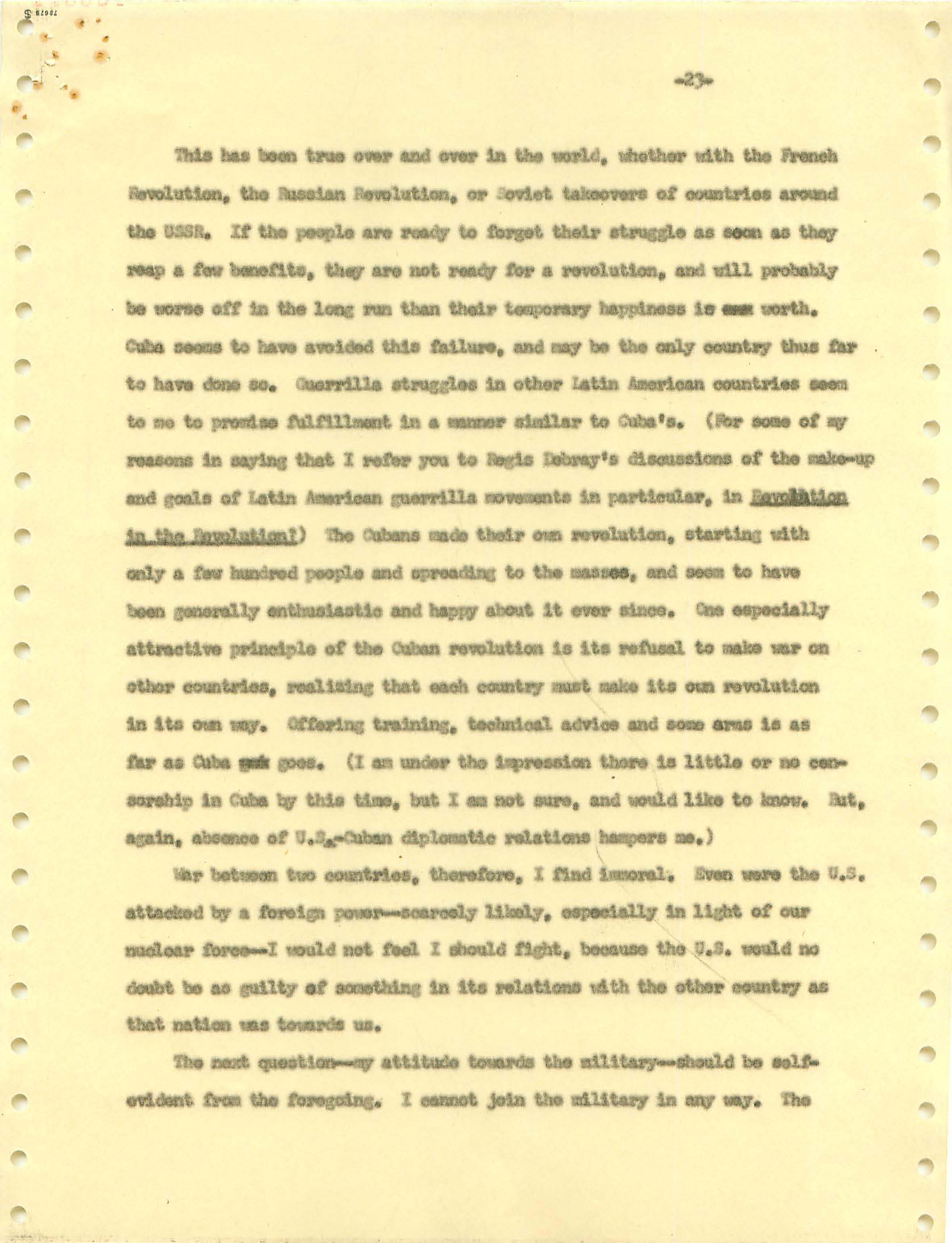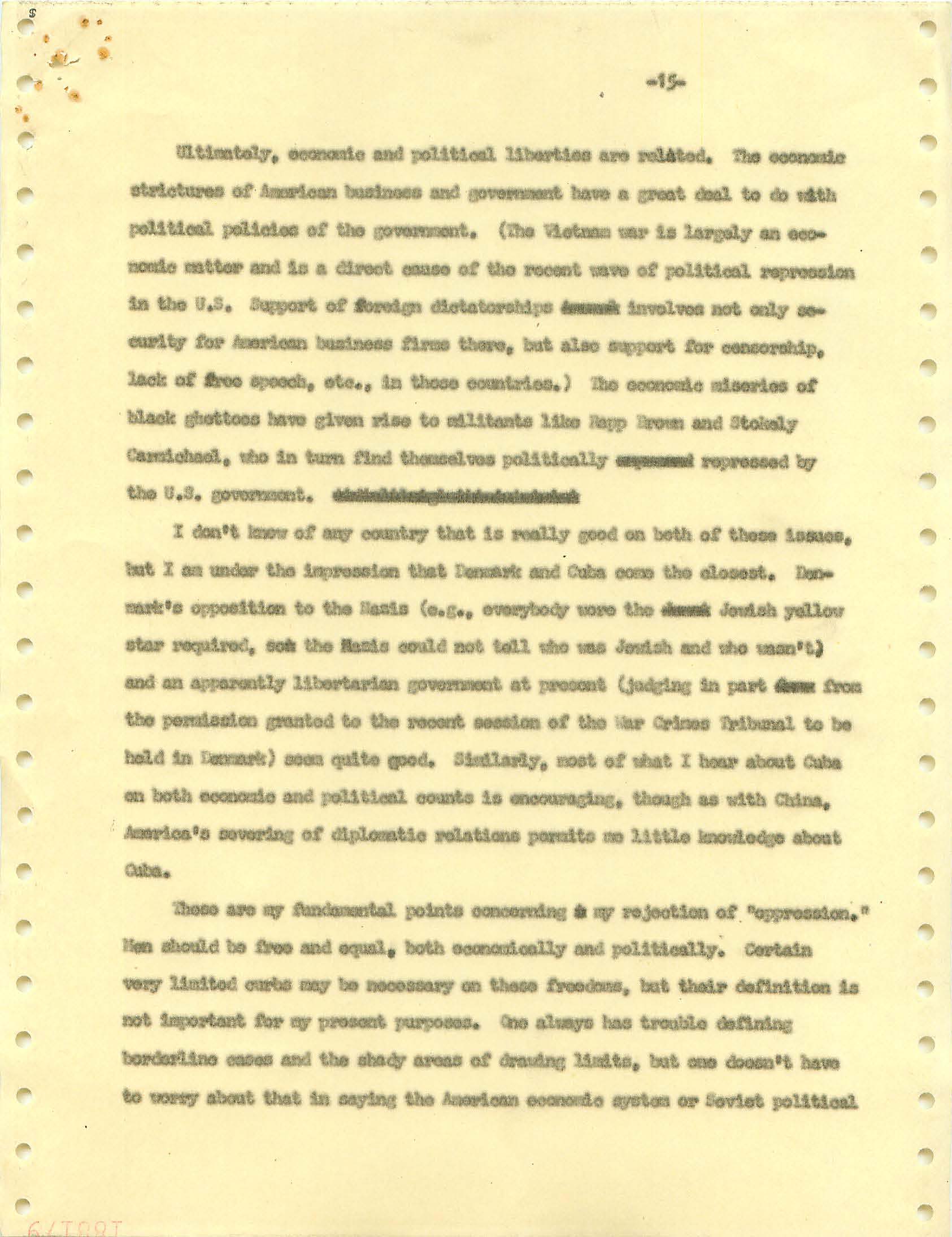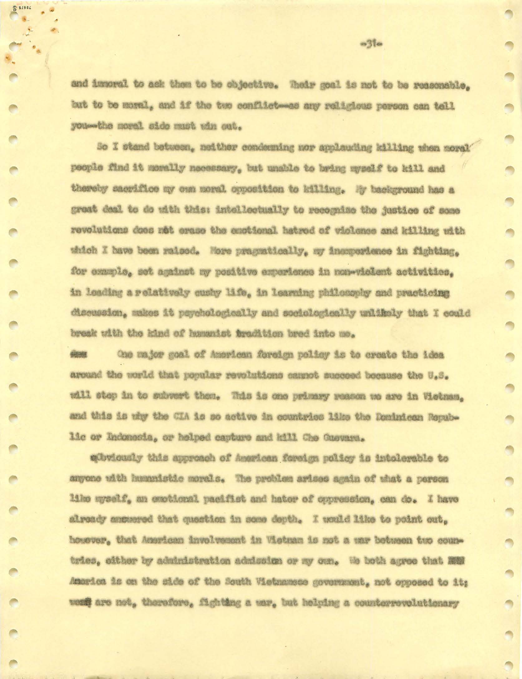 November 22, 2008 During the Vietnam War I was a draft dodger--that is, I determined to avoid getting drafted. I made sure my passport was up to date, and I took student deferments every year. In the anti-war movement, this was a virtue. For much of the rest of the country, it was at best cowardly and at worst a willingness to let other young men die in my place. (As I write, it has been fashionable for some years for many to look back on that war, however morally wrong it is now viewed, and extol service in the war. That is, avoiders of that draft still get a bad press.) I was certainly scared of fighting or getting killed, and even before Vietnam I sensed that with my propensity to challenge authority I wouldn't last long in the military; but I also believed (perhaps partly but certainly not wholly out of convenience) the US was fighting an immoral war and that refusing to fight was an act of moral rectitude. I have never believed in patriotism, and love to quote that great conservative mind, Samuel Johnson, that "patriotism is the last refuge of a scoundrel." I believed that most of the young men serving in the war were dupes of our government, and I like to think that I did not approve of harassing vets who returned home. (This is probably true because it would echo what I do remember clearly: that despite the frequent, appalling antagonism of police to the Movement--whatever that was, exactly--I never felt comfortable with fellow lefties calling them "pigs.") I also didn't buy fellow left-wingers extolling of the Viet Cong or the North Vietnamese regime, but I did view the North as a lesser evil than the often corrupt and always right-wing South Vietnamese governments. (Readers may recall that the US has long had a propensity to back "friendly" regimes regardless of their politics against "enemy" regimes, which in those days were anything that called themselves communist and today anything our leaders choose to label "terrorist.") One of the less palatable arguments to support North Vietnam was that because Vietnam was a single country, the North could not be invading the South--that is, it could not be invading its own country. I did have the nerve to burn my draft card (though I admired those who did); I was terrified of any action that would send me to prison. Until 1965, when I turned 25, if you had student deferments you were, for practical purposes, draft-proof once you were 26. That year, however, a new draft law was enacted that created a draft lottery (you were called up according to your birthday, and birthdays were randomly sequenced for a given year). In addition, those who received any student deferments after passage of the law would go into the lottery up to the age of 35. If you believed in the draft, this was certainly a fairer way of taking kids and minimizing manipulation, principled or cynical, of the rules to avoid the war. As a wily young guy, I devised the following scheme to avoid going into the lottery. It worked. When the law passed, I was a grad student at Berkeley and had a student deferment under the old dispensation that would last until September. My 26th birthday was the following February. So from my point of view I had to avoid getting a student deferement in September but string out my draft ineligibility for another five months. The following timetable is approximate. First, when I registered for coursework in September, I did not request a student deferement. As I expected, it took awhile for my draft board in South Jersey--let's guess late September or sometime in October. I received a notice that I was reclassified as 1-A (immediate draft eligibility). I think I had 30 days from the date of re-classification to appeal. Sojust before the deadline, I sent out my appeal to be classified as a CO. Probably what happened was that I then received papers to apply for this classification (which would explain why I refer to "3 days" in my statement below, though it possible that I just procrastinated.) After I submitted this statement there would be another long delay while my draft board got around to rejecting it. (I assumed they didn't read much of the statement, if any at all; I should have put at the beginning the closing punch line requesting the board members to resign in the face of my compelling arguments....) I then had at least one appeal of the rejection, which offered another 30-day window, then that appeal had to be rejected. Perhaps there were even more ways of delaying. In any event, I easily passed my 26th birthday while all this back-and-forth went on. Footnote: