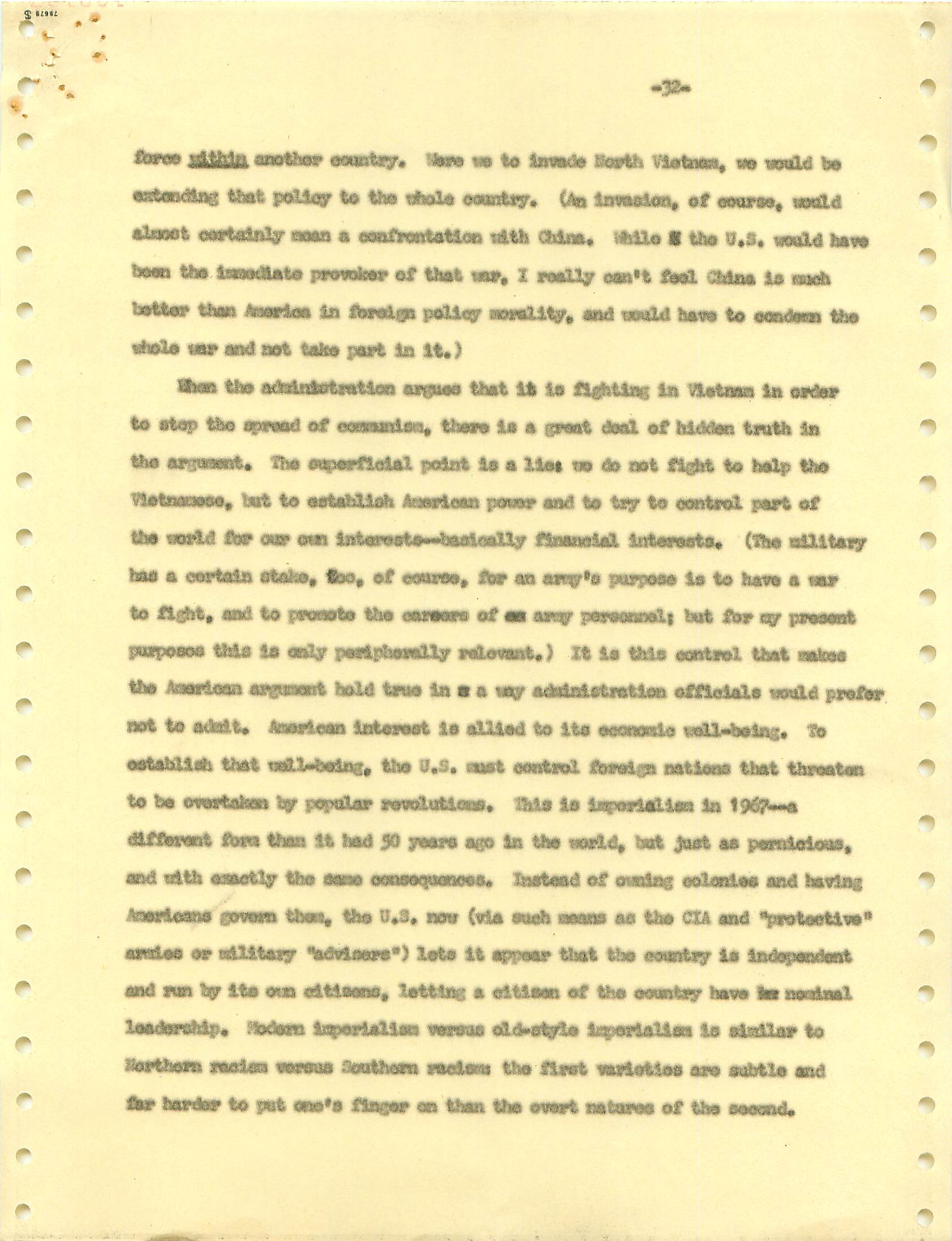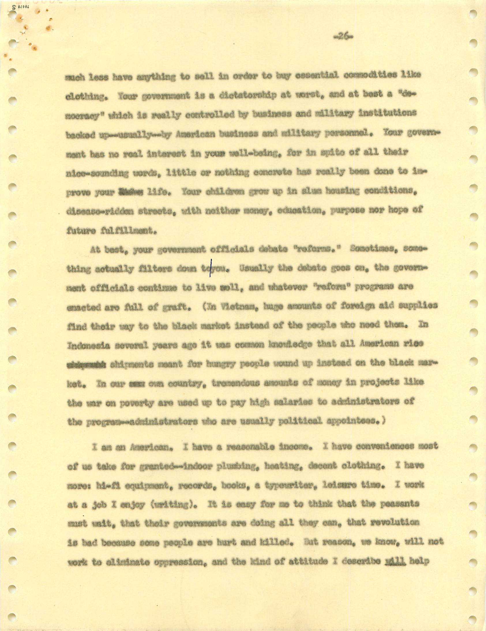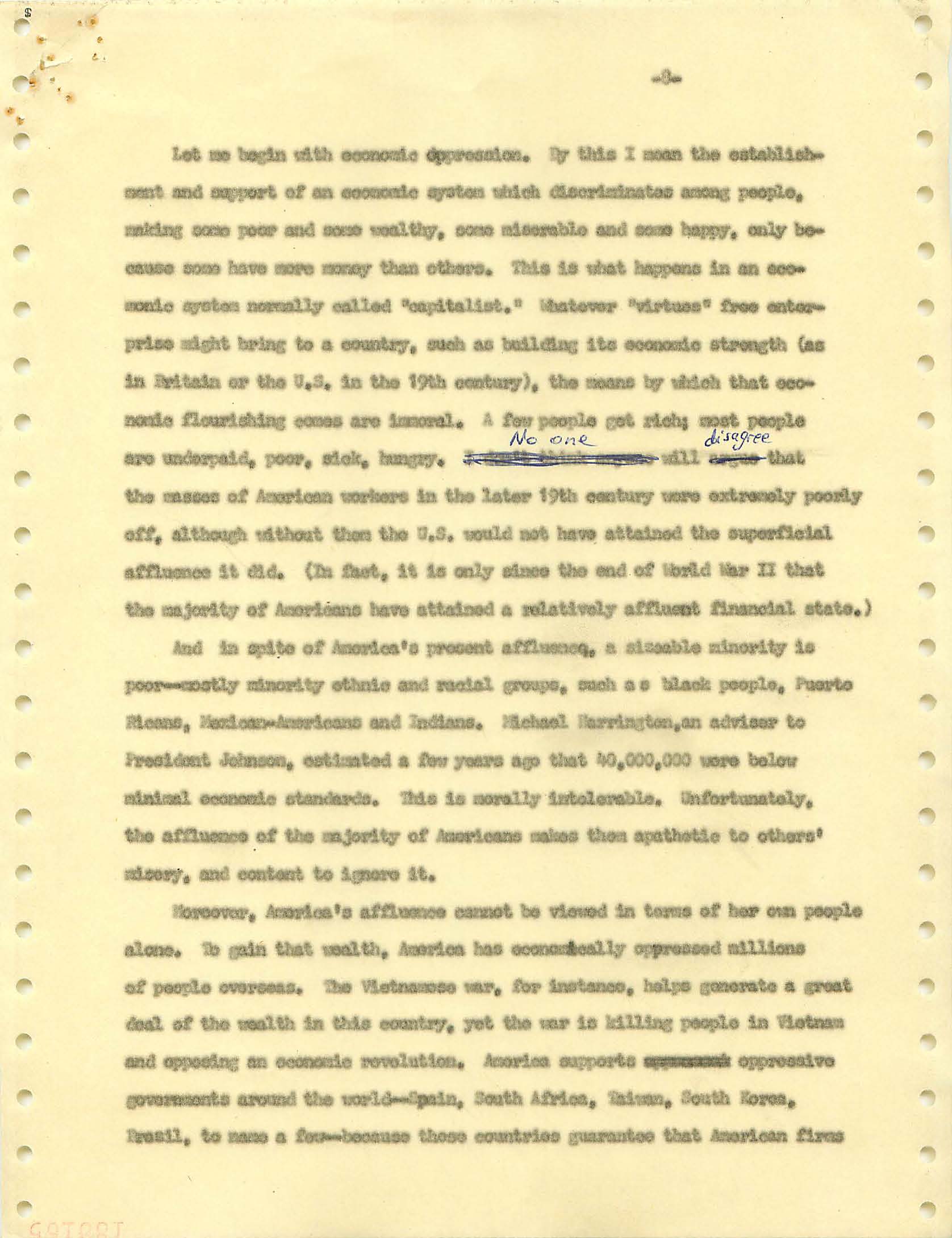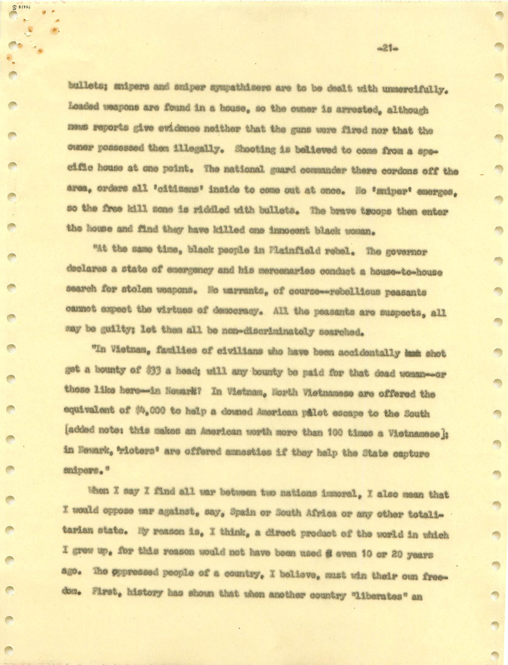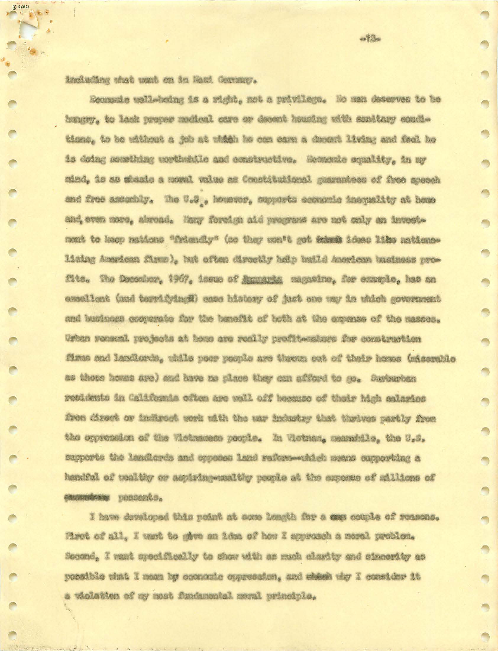 November 22, 2008 During the Vietnam War I was a draft dodger--that is, I determined to avoid getting drafted. I made sure my passport was up to date, and I took student deferments every year. In the anti-war movement, this was a virtue. For much of the rest of the country, it was at best cowardly and at worst a willingness to let other young men die in my place. (As I write, it has been fashionable for some years for many to look back on that war, however morally wrong it is now viewed, and extol service in the war. That is, avoiders of that draft still get a bad press.) I was certainly scared of fighting or getting killed, and even before Vietnam I sensed that with my propensity to challenge authority I wouldn't last long in the military; but I also believed (perhaps partly but certainly not wholly out of convenience) the US was fighting an immoral war and that refusing to fight was an act of moral rectitude. I have never believed in patriotism, and love to quote that great conservative mind, Samuel Johnson, that "patriotism is the last refuge of a scoundrel." I believed that most of the young men serving in the war were dupes of our government, and I like to think that I did not approve of harassing vets who returned home. (This is probably true because it would echo what I do remember clearly: that despite the frequent, appalling antagonism of police to the Movement--whatever that was, exactly--I never felt comfortable with fellow lefties calling them "pigs.") I also didn't buy fellow left-wingers extolling of the Viet Cong or the North Vietnamese regime, but I did view the North as a lesser evil than the often corrupt and always right-wing South Vietnamese governments. (Readers may recall that the US has long had a propensity to back "friendly" regimes regardless of their politics against "enemy" regimes, which in those days were anything that called themselves communist and today anything our leaders choose to label "terrorist.") One of the less palatable arguments to support North Vietnam was that because Vietnam was a single country, the North could not be invading the South--that is, it could not be invading its own country. I did have the nerve to burn my draft card (though I admired those who did); I was terrified of any action that would send me to prison. Until 1965, when I turned 25, if you had student deferments you were, for practical purposes, draft-proof once you were 26. That year, however, a new draft law was enacted that created a draft lottery (you were called up according to your birthday, and birthdays were randomly sequenced for a given year). In addition, those who received any student deferments after passage of the law would go into the lottery up to the age of 35. If you believed in the draft, this was certainly a fairer way of taking kids and minimizing manipulation, principled or cynical, of the rules to avoid the war. As a wily young guy, I devised the following scheme to avoid going into the lottery. It worked. When the law passed, I was a grad student at Berkeley and had a student deferment under the old dispensation that would last until September. My 26th birthday was the following February. So from my point of view I had to avoid getting a student deferement in September but string out my draft ineligibility for another five months. The following timetable is approximate. First, when I registered for coursework in September, I did not request a student deferement. As I expected, it took awhile for my draft board in South Jersey--let's guess late September or sometime in October. I received a notice that I was reclassified as 1-A (immediate draft eligibility). I think I had 30 days from the date of re-classification to appeal. Sojust before the deadline, I sent out my appeal to be classified as a CO. Probably what happened was that I then received papers to apply for this classification (which would explain why I refer to "3 days" in my statement below, though it possible that I just procrastinated.) After I submitted this statement there would be another long delay while my draft board got around to rejecting it. (I assumed they didn't read much of the statement, if any at all; I should have put at the beginning the closing punch line requesting the board members to resign in the face of my compelling arguments....) I then had at least one appeal of the rejection, which offered another 30-day window, then that appeal had to be rejected. Perhaps there were even more ways of delaying. In any event, I easily passed my 26th birthday while all this back-and-forth went on. Footnote: